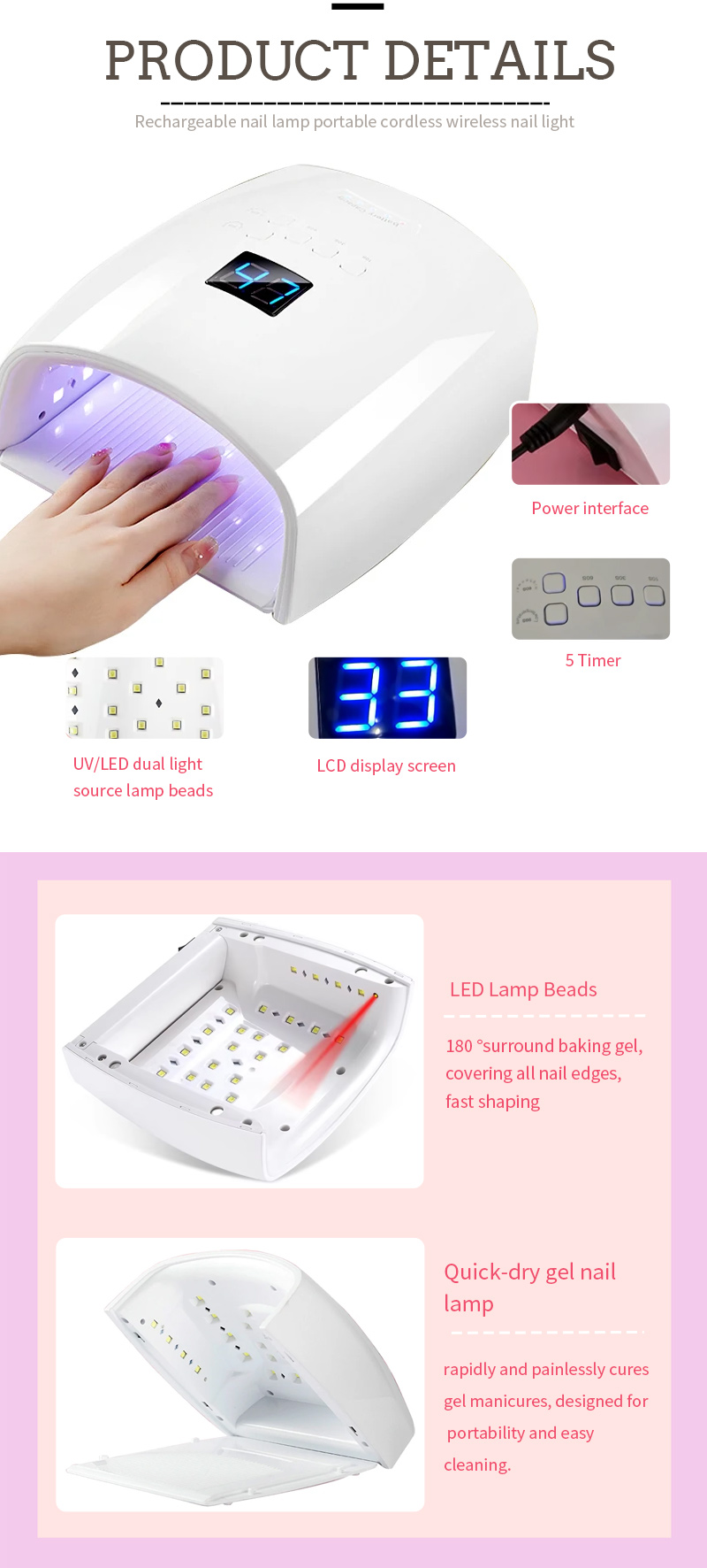 該產品保證膠水乾燥均勻,不收縮。其雙光源提供溫和加熱,防止手變色和眼睛疲勞,適合手和腳,提供非常快速的干燥效果。