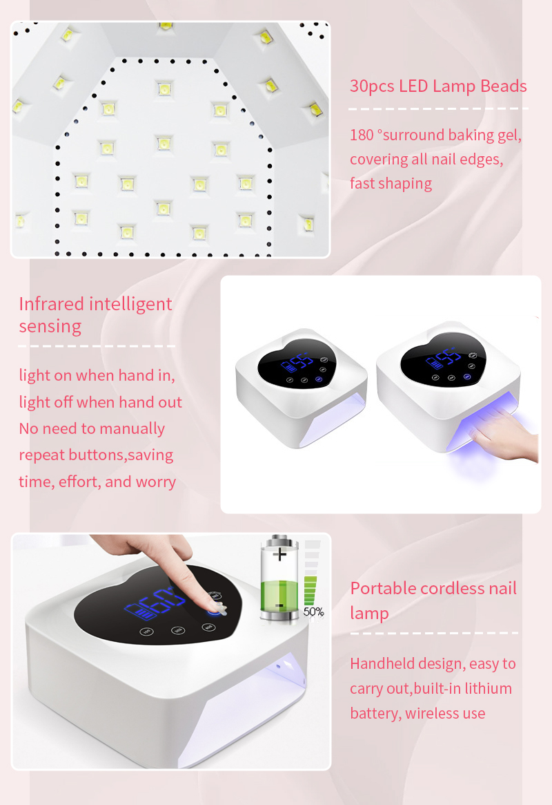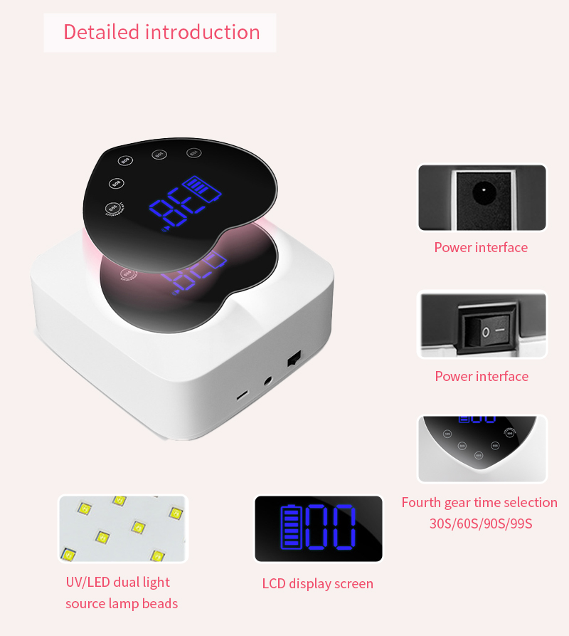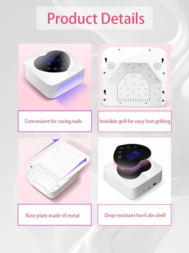 該產品保證膠水乾燥均勻,不收縮。其雙光源提供溫和加熱,防止手變色和眼睛疲勞,適合手和腳,提供非常快速的干燥效果。