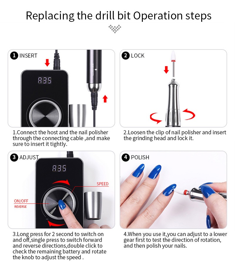 這款去角質35000轉電釘鑽換鑽操作方法,即插即拔,簡單方便,更換完成後即可使用。
