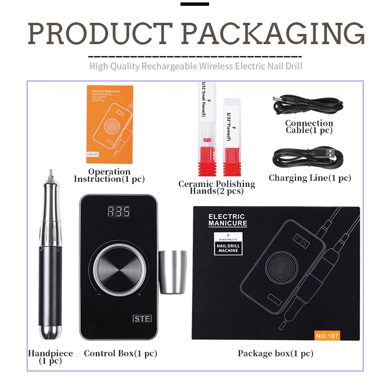 這款去角質35,000轉電動美甲鑽套裝內容有打磨筆產品、USB充電線、產品使用說明書以及輕巧便攜的盒子。