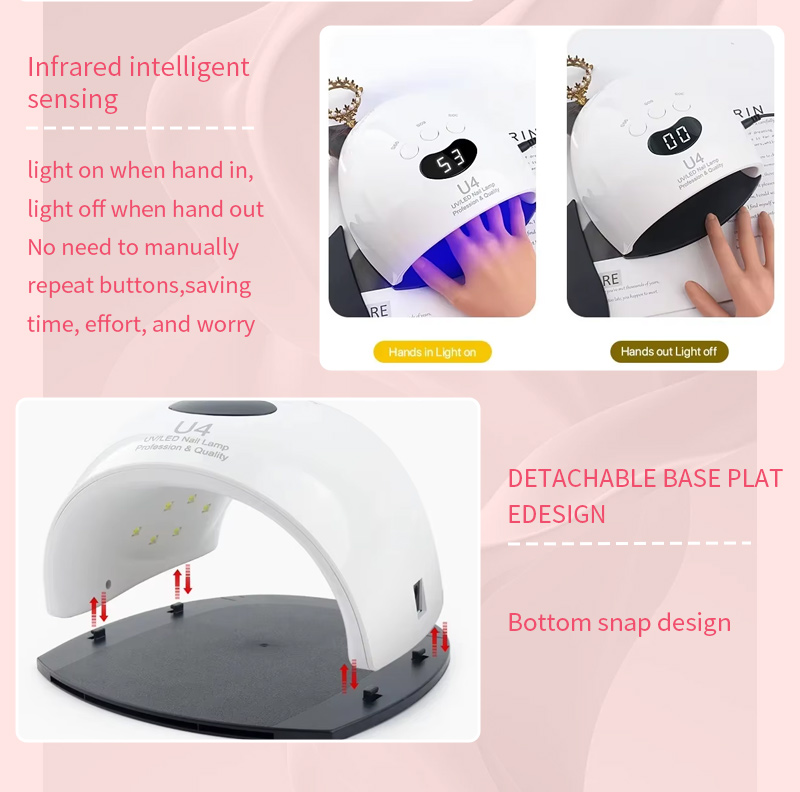 這款高品質 LED 指甲乾燥燈可確保膠水乾燥均勻且不收縮。其雙光源提供溫和加熱,防止手變色和眼睛疲勞,適合手和腳,提供非常快速的干燥效果。