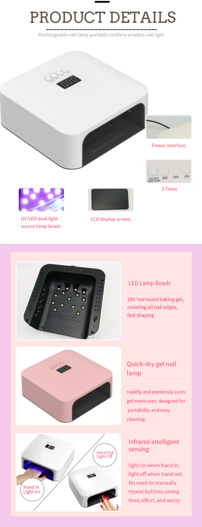 高品質快速曬甲燈採用紅外智能感應技術,手靠近時自動亮起,手離開時自動關閉,免去了反复按下按鈕的麻煩,省時省力。高功率烤膠無需漫長等待,省時又省力。