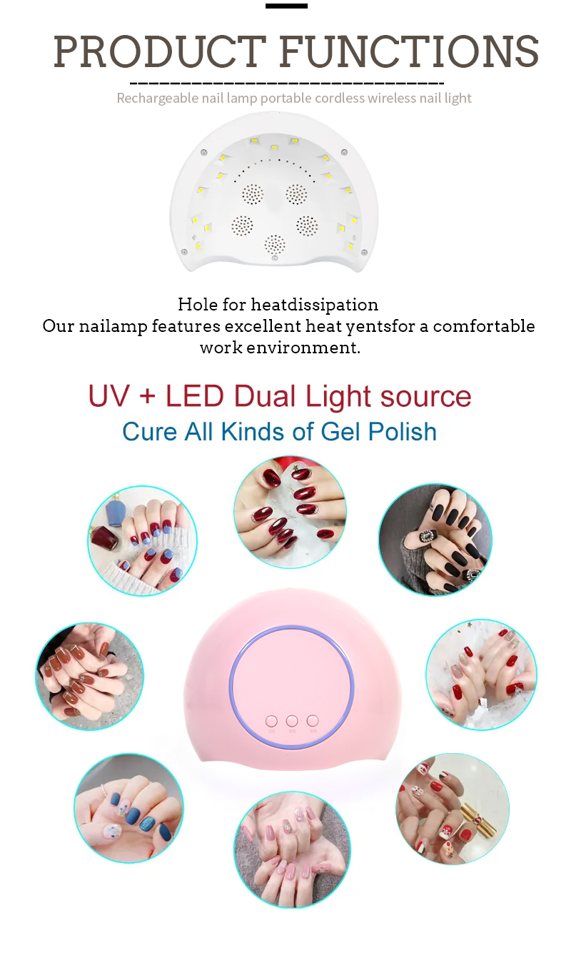 該產品保證膠水乾燥均勻,不收縮。其雙光源提供溫和加熱,防止手變色和眼睛疲勞,適合手和腳,提供非常快速的干燥效果。