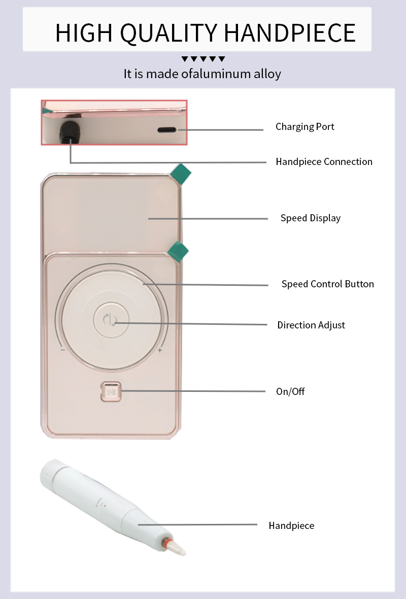 這款高速低噪音磨筆顯示設計,帶砂筆插座,LCD液晶顯示器可顯示轉數/功率/方向,速度切換旋鈕,順時針/逆時針切換按鈕,暫停按鈕,30,000轉專業電機,旋入式鎖定磨頭。