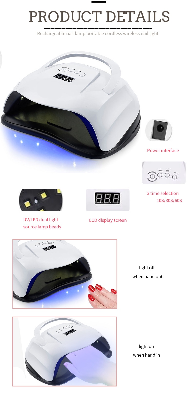 便攜式指甲烘乾燈採用紅外智能感應技術,手靠近時自動亮起,手離開時自動關閉,免去反复按鍵的麻煩,省時省力。高功率烤膠無需漫長等待,省時又省力。
