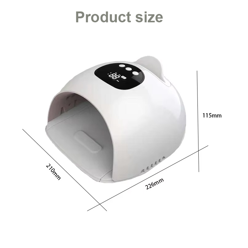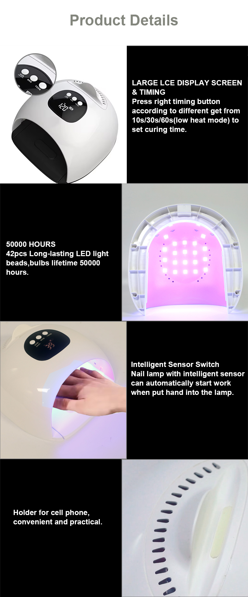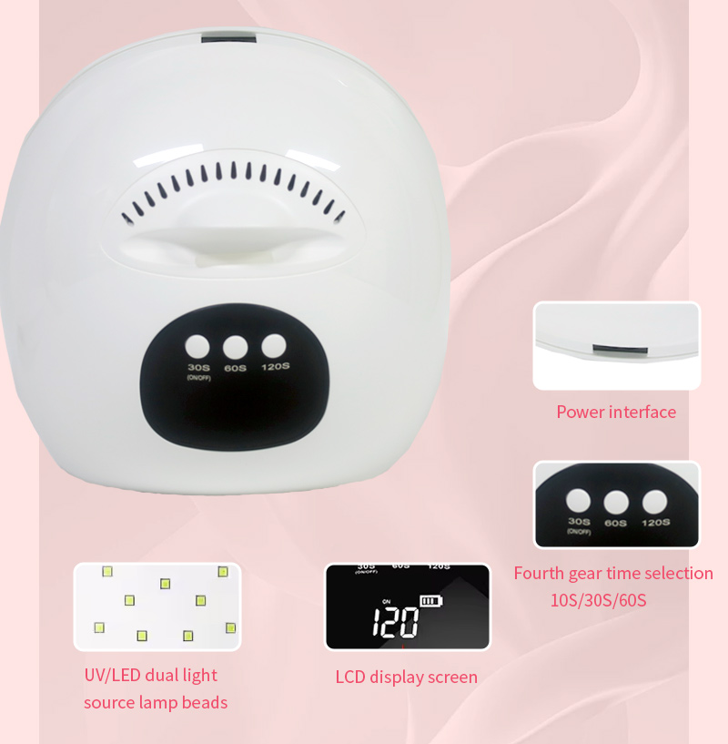該產品保證膠水乾燥均勻,不收縮。其雙光源提供溫和加熱,防止手變色和眼睛疲勞,適合手和腳,提供非常快速的干燥效果。