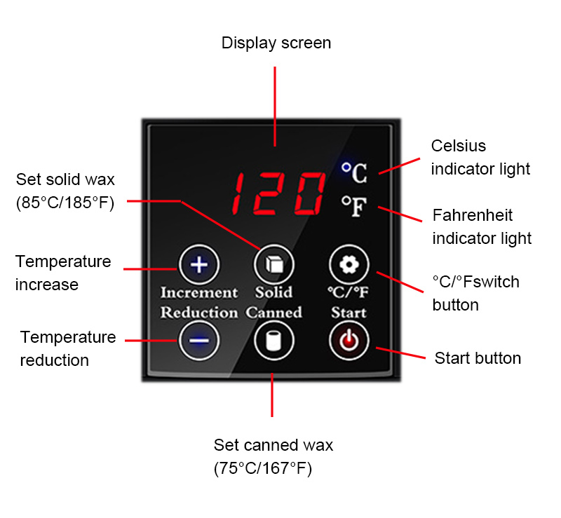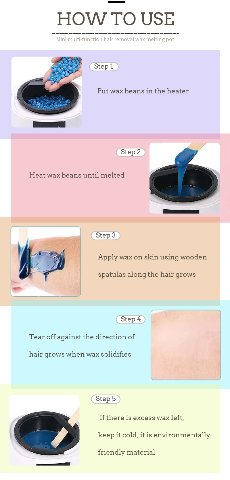 產品脫毛蠟操作方法,溫度越高蠟融化越快,溫度越低蠟融化越慢,先倒入適量脫毛蠟豆,加熱至蠟豆融化,然後在脫毛部位均勻塗上脫毛蠟,最後逆毛髮生長方向撕下。