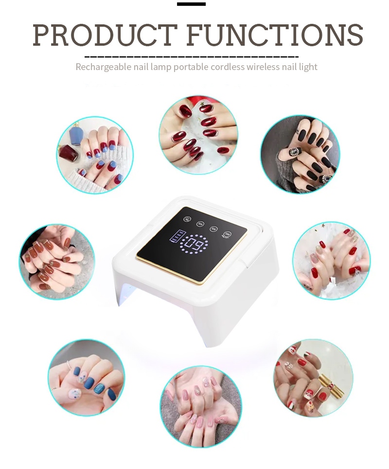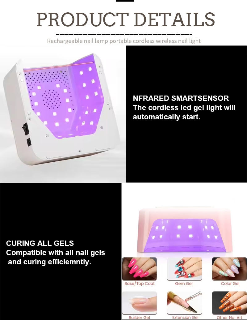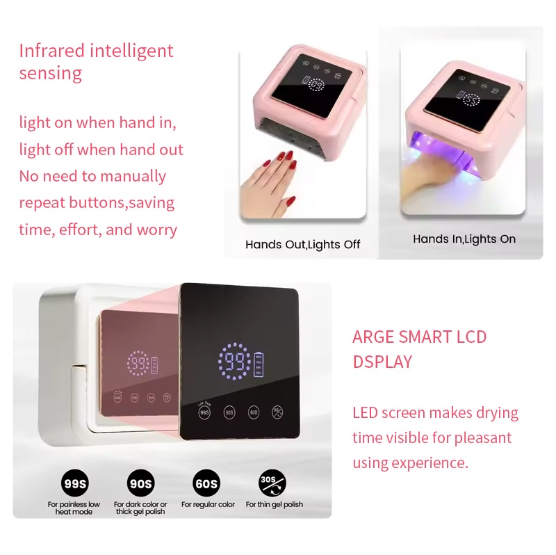 方形指甲烘乾燈採用紅外智能感應技術,手靠近時自動亮起,手離開時自動熄滅,免去反复按鍵的麻煩,省時省力。高功率烤膠無需漫長等待,省時又省力。