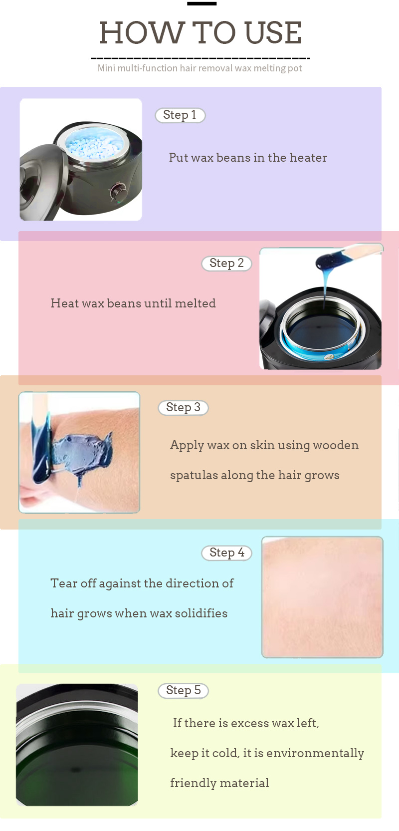 產品脫毛蠟操作方法,溫度越高蠟融化越快,溫度越低蠟融化越慢,先倒入適量脫毛蠟豆,加熱至蠟豆融化,然後在脫毛部位均勻塗上脫毛蠟,最後逆毛髮生長方向撕下。